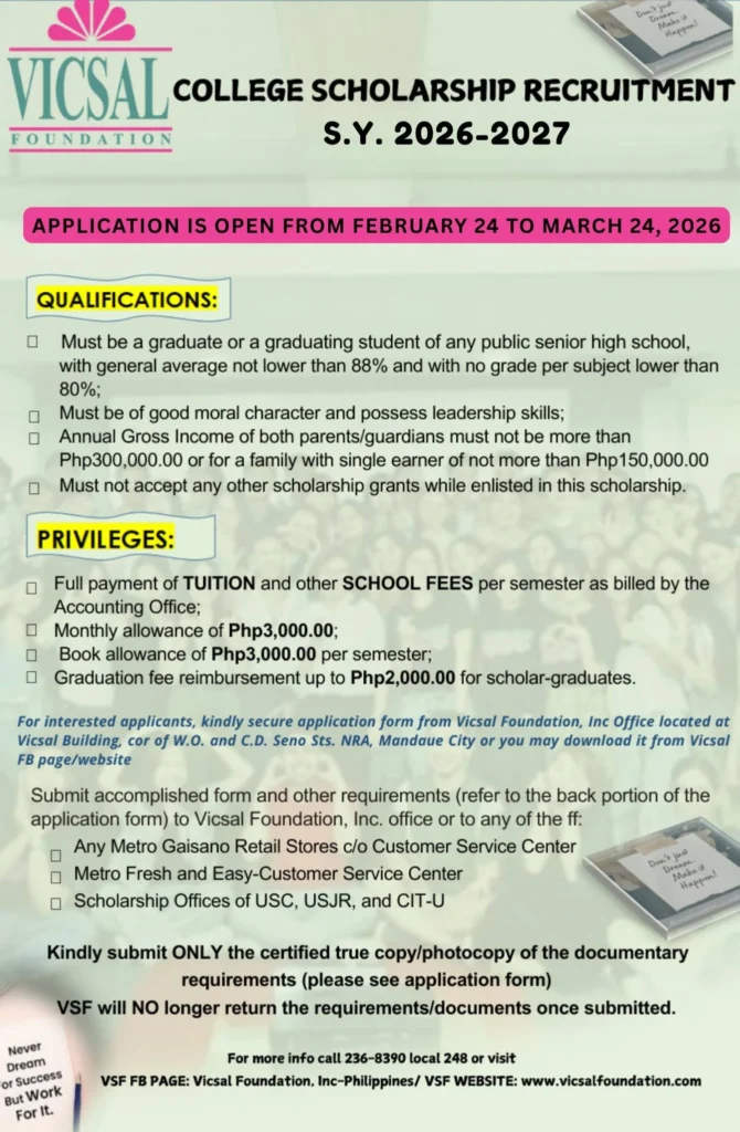 The Vicsal Foundation, Inc. (VFI) is now accepting applications for its College Scholarship Program for the 2026-2027 academic year. This initiative aims to provide full financial support to underprivileged but academically gifted public senior high school graduates.